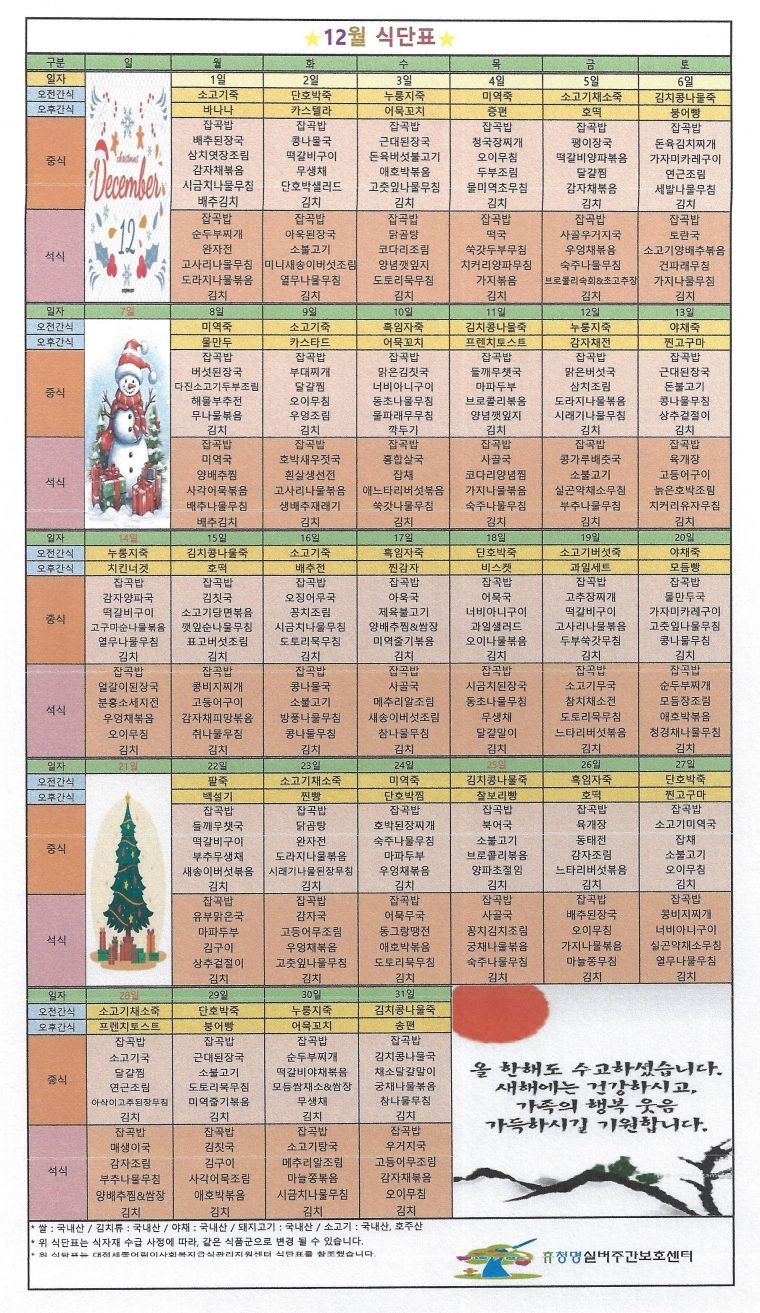 식단표 게시판 상세 제목 12월 식단표 입니다. 작성자 관리자(cmcare) (218.150.17.72) 작성날짜 2025-11-28 10:40:48 조회수 6 휴청명 블로그도 많이 관심가져주세요~ 클릭하시면 블로그 구경 가능합니다. 인사말씀, 휴청명실버주간님의 블로그 : 네이버 블로그 첨부파일 25.12월 식단표.pdf 내용 보기 이전글 11월 식단표 입니다. 2025-11-01