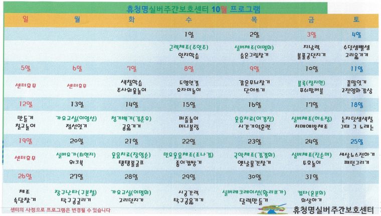프로그램 게시판 상세 제목 10월 프로그램표 입니다. 작성자 관리자(cmcare) (218.150.17.72) 작성날짜 2025-09-28 09:46:04 조회수 18 인사말씀, 휴청명실버주간님의 블로그 : 네이버 블로그 첨부파일 25.10월 프로그램.pdf 내용 보기 이전글 9월 프로그램표 입니다. 2025-09-01