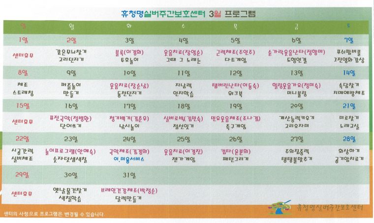 프로그램 게시판 상세 제목 3월 프로그램표 입니다. 작성자 관리자(cmcare) (218.150.17.72) 작성날짜 2026-02-26 15:32:46 조회수 1 첨부파일 26.3월 프로그램.pdf 내용 보기 이전글 2월 프로그램표 입니다. 2026-01-29